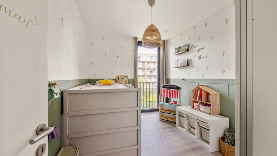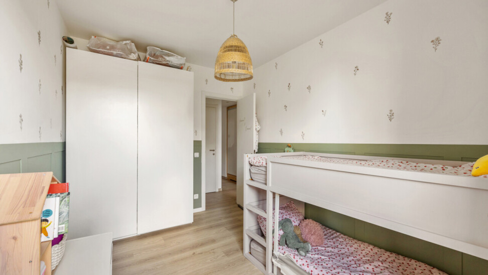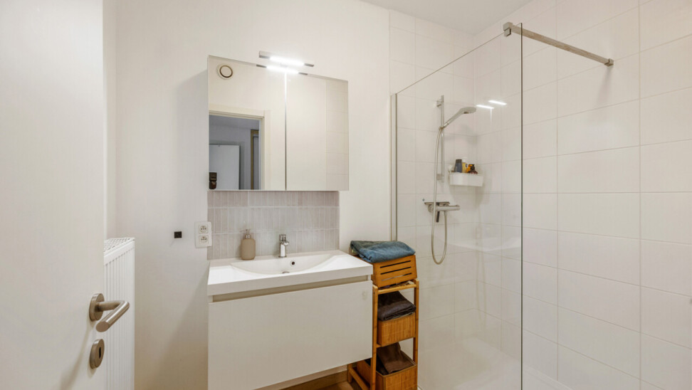 Langs de nachthal bereik je twee volwaardige slaapkamers, een stijlvolle badkamer met moderne inloopdouche, een apart toilet en een ruime berging met alle technische installaties – praktisch en netjes weggewerkt.