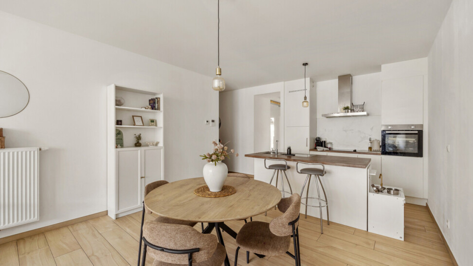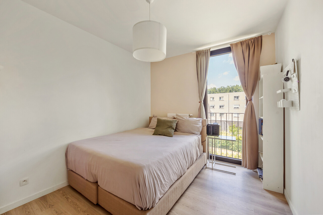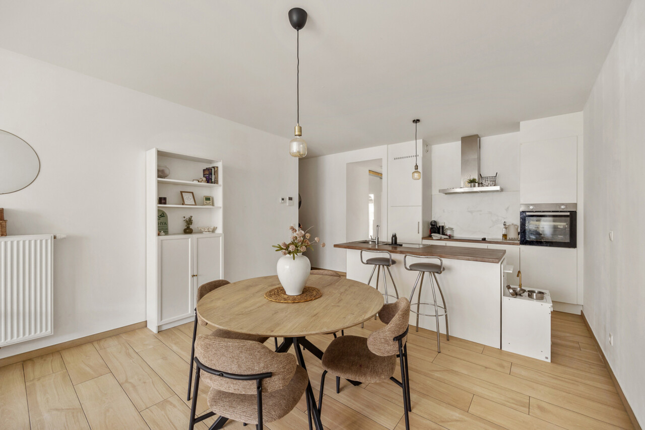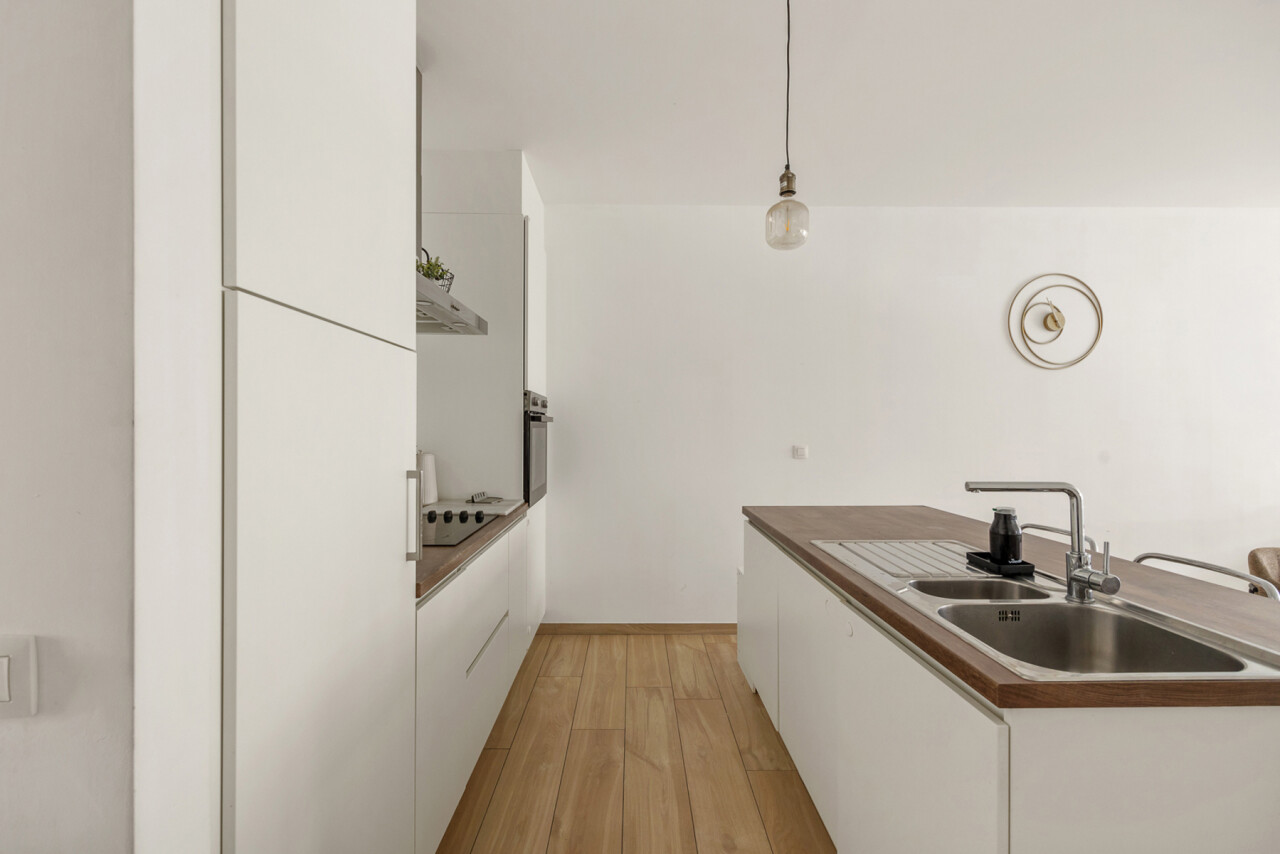 Je komt binnen in een ruime leefruimte met open keuken en centraal keukeneiland – de perfecte plek om te koken, aperitieven of gezellig samen te zijn. Dankzij de plafondhoogte van 2,7 meter en het zuidoostgerichte terras van 7m² baadt het appartement in natuurlijk licht en voelt het bijzonder ruim aan.