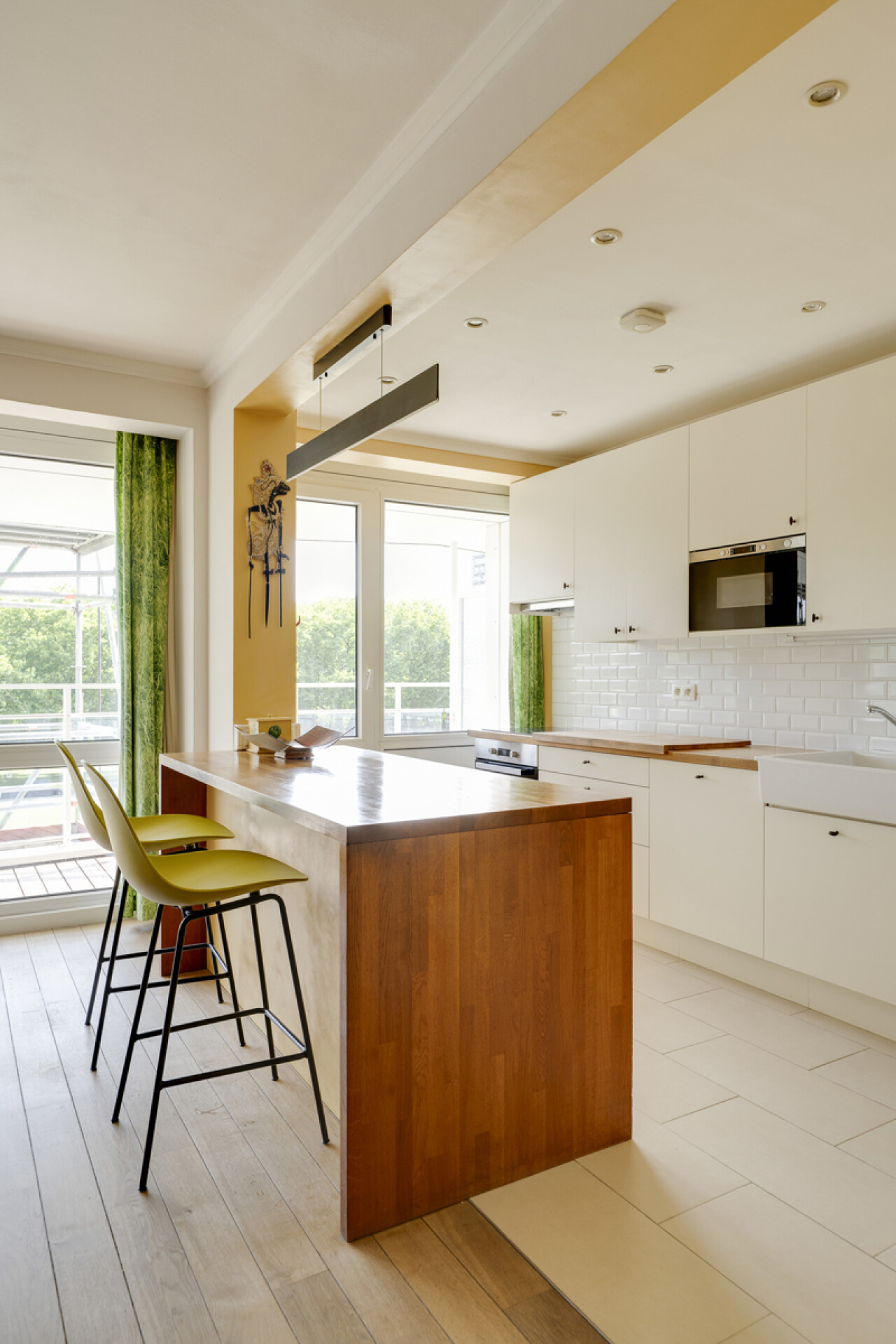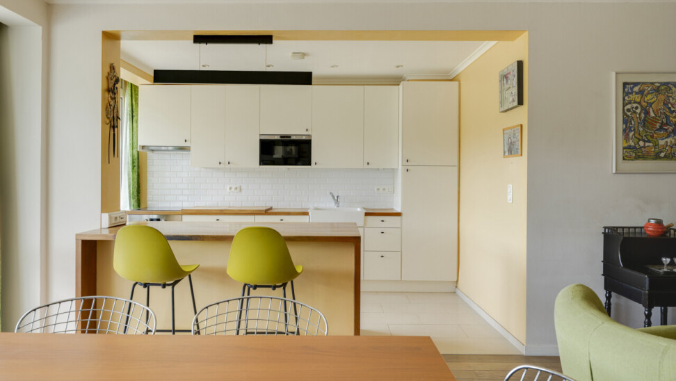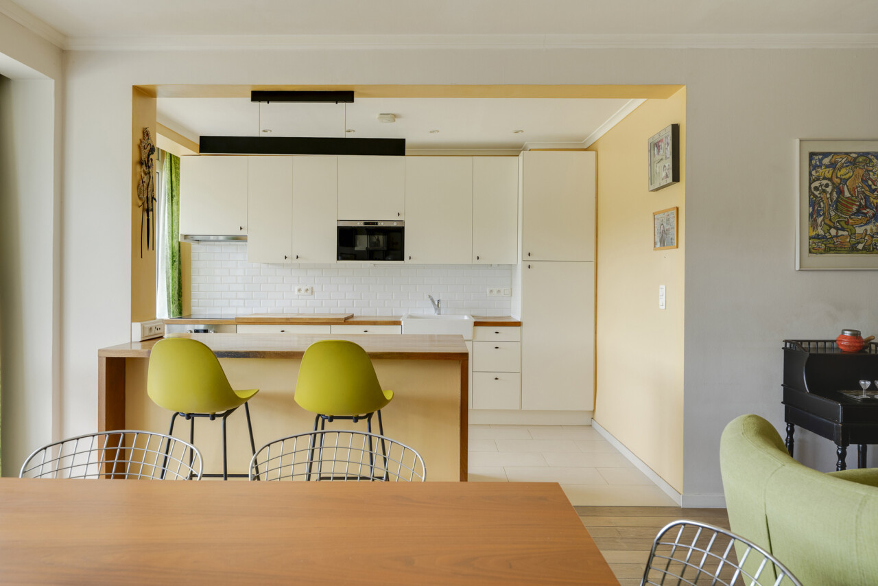 Binnenin geniet u van een ruime leefruimte met parketvloer, waar natuurlijk licht overvloedig binnenvalt. De volledig geïnstalleerde open keuken is uitgerust met onder meer een dubbele ijskast en een ontbijttoog – perfect voor een gezellige ochtend.