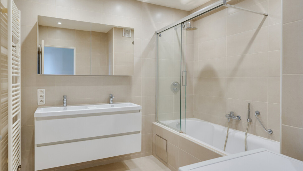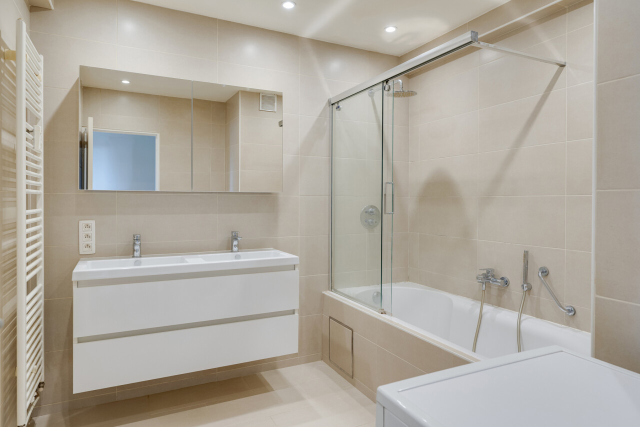 De moderne badkamer beschikt over een ligbad, een dubbel lavabomeubel, en er is een aansluiting voorzien voor wasmachine en droogkast. Daarnaast is er een apart toilet en een praktische berging in de inkomhal, ideaal voor extra opbergruimte.